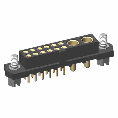 Datamate 2-Row Mix-Tek Female Vertical Throughboard Connector, Hexagonal slotted jackscrews, 12 x 3mm Throughboard signal contacts, 2 x 3.5mm Throughboard Power contacts